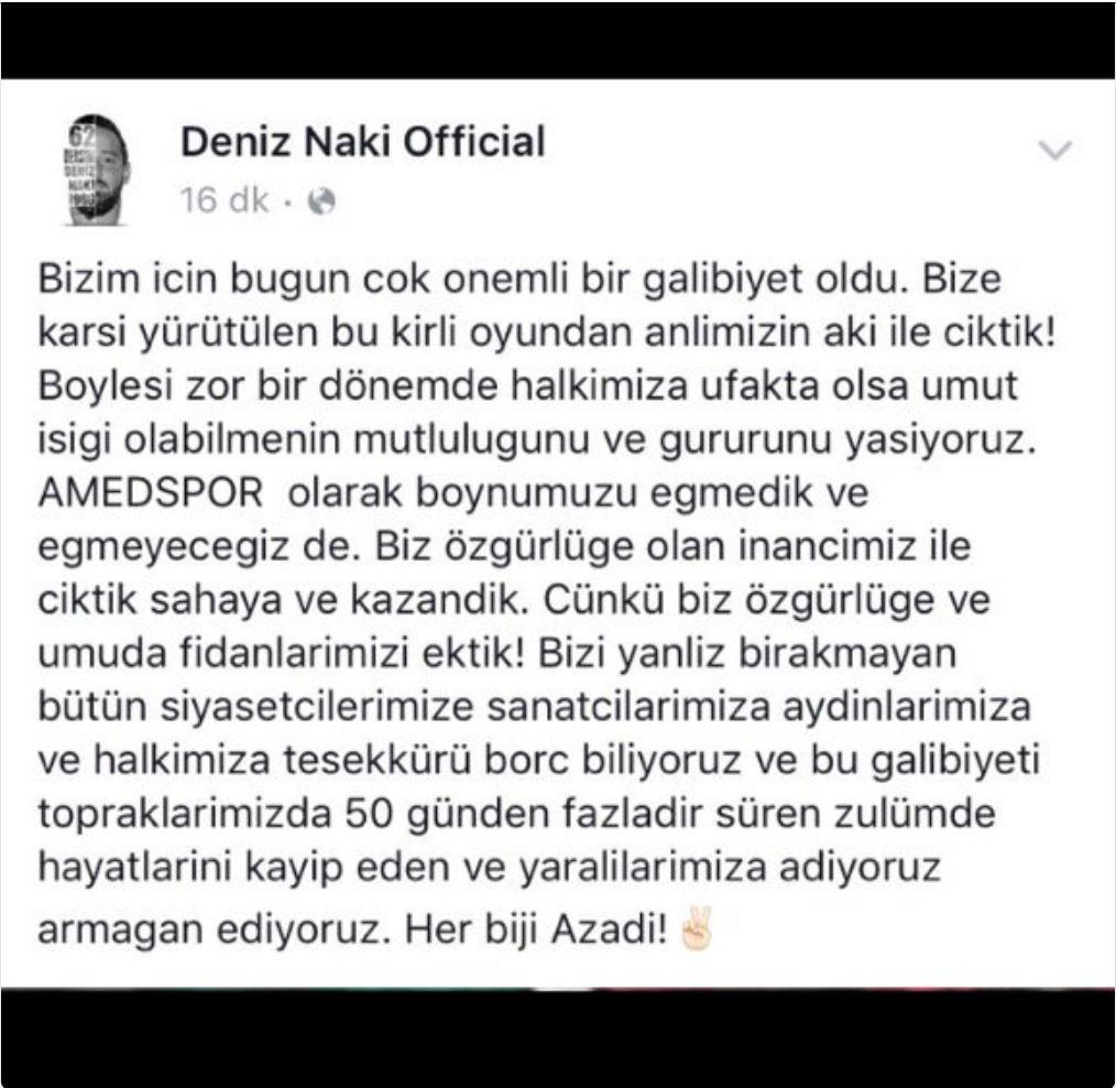 Il post, pubblicato sui suoi account social, costa al giocatore altre 12 giornate di squalifica. Al club un’irruzione della polizia nella sede e il sequestro dei computer. Ai tifosi la squalifica per la storica partita seguente, contro il Fenerbache (che – almeno ogni tanto una buona notizia – esprimerà solidarietà nei confronti di Naki e dei tifosi dell’Amedspor) [6] [7].