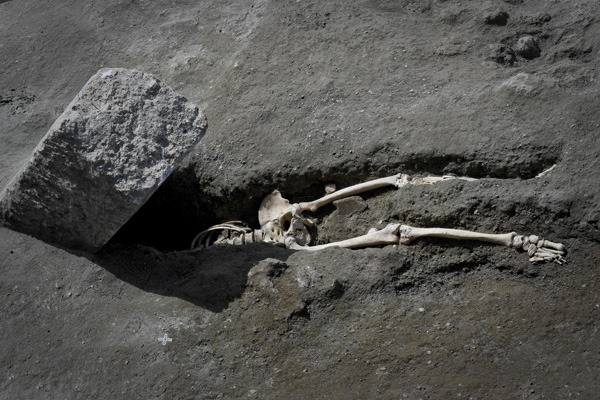 Era un uomo di poco più di 30 anni, claudicante a causa di una seria infezione ossea. Per questo, probabilmente, anziché provare a scappare lontano, aveva cercato scampo tra il Vicolo delle Nozze d’Argento e il Vicolo dei Balconi, nella Regio V. Gli archeologi lo hanno ritrovato così, riverso sulla schiena, con il torace schiacciato da un grosso blocco di pietra. Un masso di circa 300kg (forse uno stipite) che, trascinato dalla furia distruttiva dell’eruzione, lo ha investito colpendolo al busto.