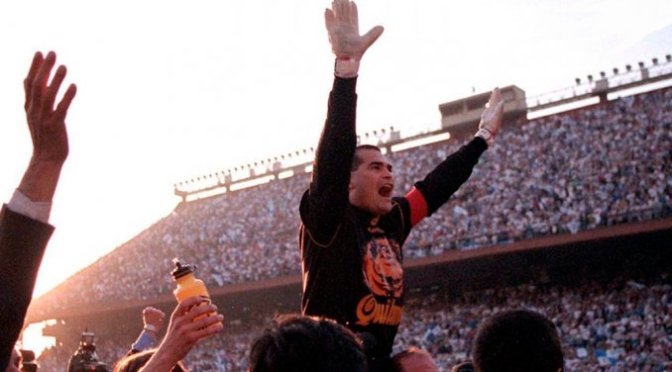 Mondiale di Francia ’98. Due pareggi contro Spagna e Bulgaria e una vittoria contro la Nigeria valgono gli ottavi di finale. A Lens, contro la Francia padrona di casa (e poi vincitrice del Campionato), la tattica del Paraguay è chiara: difesa ad oltranza nella speranza di arrivare ai rigori. Il muro biancorosso resiste fino al 114esimo. Quando, a soli 6 minuti dai calci di rigore è il difensore centrale Laurent Blanc, in un’inedita sortita offensiva, a mettere fine alle speranze paraguaiane di proseguire il cammino nella competizione. A diventare l’immagine simbolo della partita, però, non sarà né il goal né la gioia incontenibile dei transalpini. Subito dopo il fischio finale le telecamere riprenderanno Chilavert percorrere avanti e indietro tutta la sua metà campo, rincuorando e scuotendo i compagni in lacrime. In alcuni casi addirittura urlandogli a pochi centimetri dal viso. Che si rialzassero da terra e uscissero dallo stadio a testa alta, ci avrebbe pensato lui a caricarsi sulle spalle la tristezza di tutti.