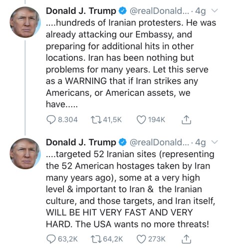 “Se l’Iran dovesse colpire qualche americano o dei beni americani, abbiamo preso di mira 52 siti iraniani (che rappresentano i 52 ostaggi americani presi dall’Iran molti anni fa), alcuni di altissimo livello e importanti per l’Iran e la cultura iraniana, e quegli obiettivi, e l’Iran stesso, SARANNO COLPITI MOLTO VELOCEMENTE E MOLTO DURAMENTE. Gli Stati Uniti non vogliono più minacce!”.