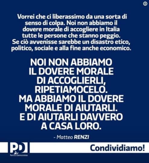 Parlare di migranti e di accoglienza sui social network è complicato anche per gli esperti e per i giornalisti più preparati. Farlo attraverso un’info-grafica di venti parole è un’impresa ardua anche per lo spin doctor più smaliziato. Perchè semplificazione dopo semplificazione, sintesi dopo sintesi, correzione dopo correzione, il rischio di scrivere una cazzata diventa enorme. E se scrivi una cazzata, il rischio che non sia neanche originale, ma sia già il cavallo di battaglia di qualcun altro è enorme. E se la cazzata è “aiutarli a casa loro” allora è praticamente certo, oltretutto, che quel qualcun altro non sia un genio.Inseguire il M5s sulla strada del “condividiamo-condividete-dacondivideretuttii!!11!!” non è strategico, è patetico. Perchè nonostante tutto la differenza la fanno, la devono fare, e la faranno, i contenuti. E i princìpi. Anzi, soprattutto i princìpi.